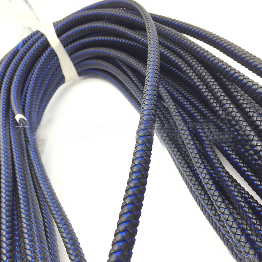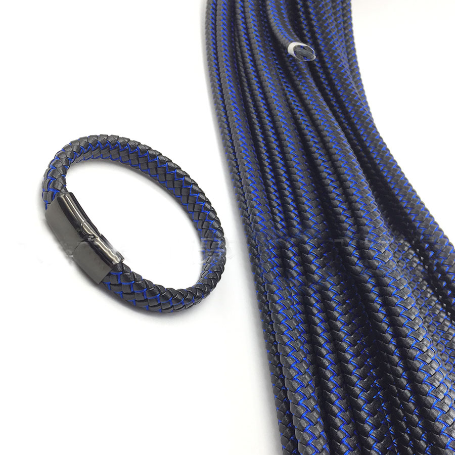 Шнур из черной эко-кожи (микрофибра) плетеный, со вставкой в плетение синтетической нити - цвета синий металлик и под серебро  Коса из 8 шнуров.