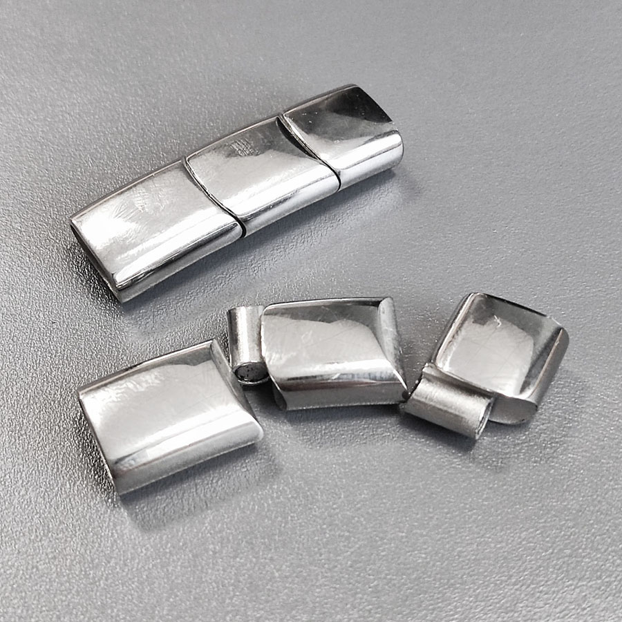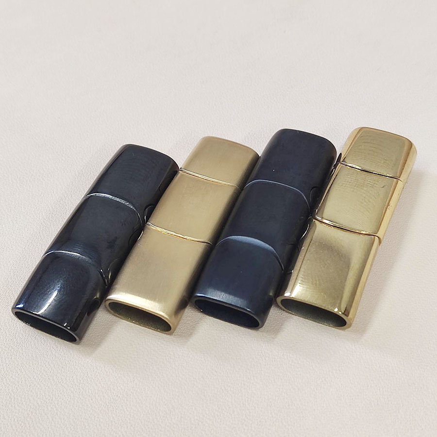 Замок магнитный из нержавеющей стали с покрытиями разных цветов - для плоских кожаных шнуров 12х6 мм, внешние габариты: около 14х43 мм, размер среднего съемного звена - 15 мм