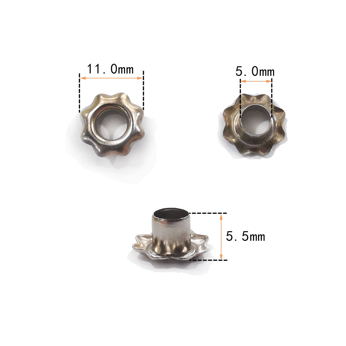 Размеры: наружный размер 11 мм, внутренний диаметр 5 мм, общая высота ножки 5,5 мм. Толщина металла - 0,5 мм.