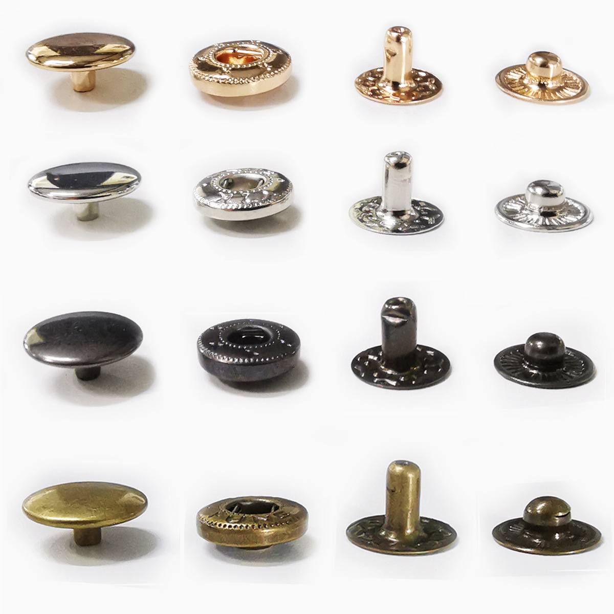 В наборе: 100 комплектов кнопок (состоят из четырех частей). Цвета: 25 штук золото, 25 штук серебро, 25 штук черно-серый, 25  штук темная латунь и инструмент для установки (2 установщика, пробойник, плашка)