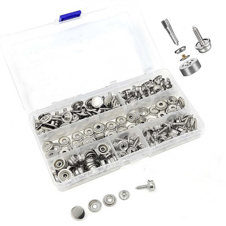 В наборе: 50 кнопок (состоят из четырех частей), 25 винтов и инструмент для установки (установщик, плашка, пробойник)