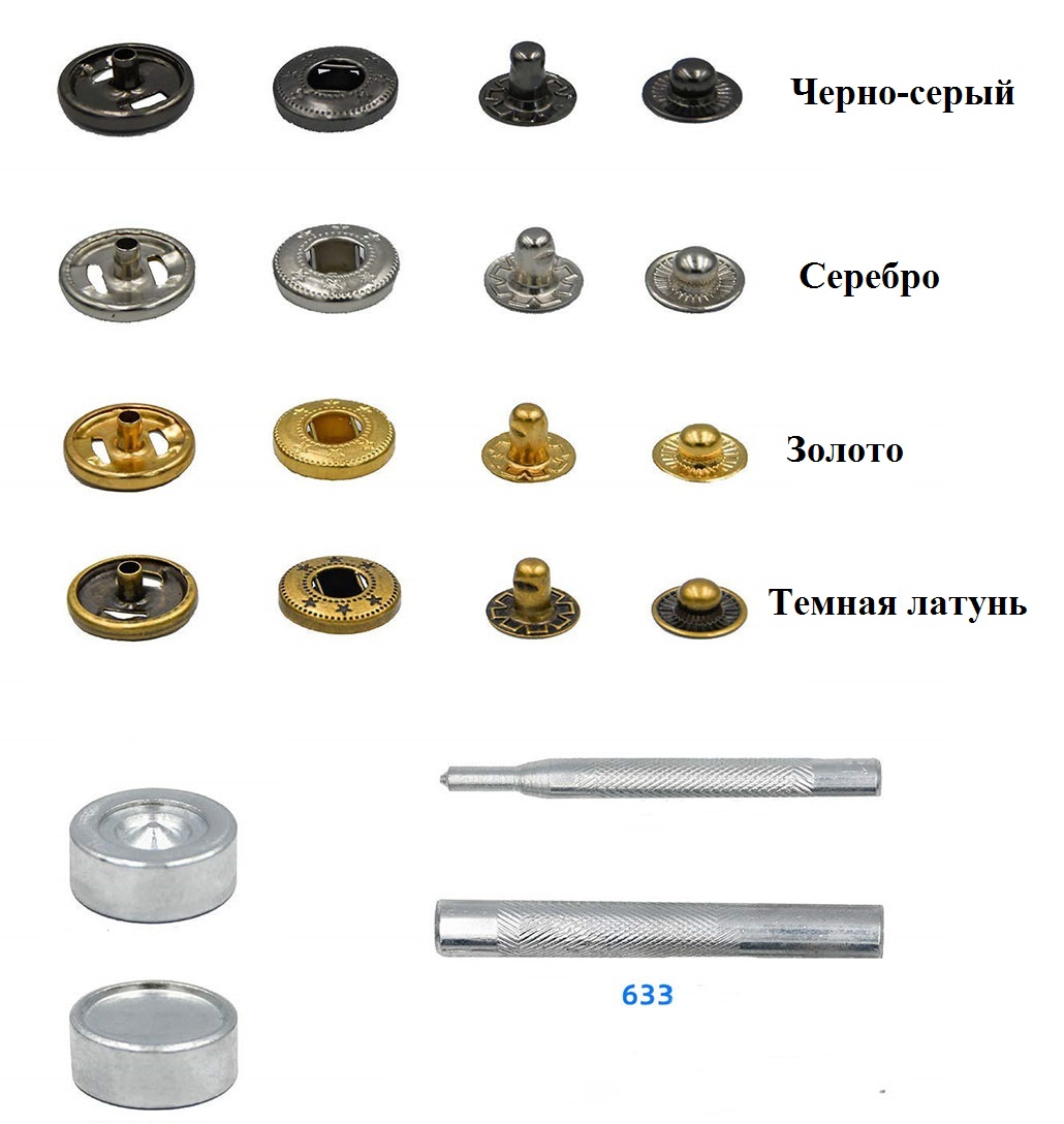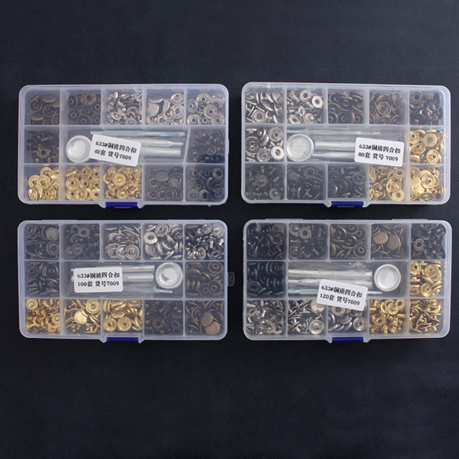 В наборе: 40 комплектов кнопок (состоят из четырех частей) 10 штук золото, 10 штук серебро, 10 штук черно-серый, 10 штук темная латунь и инструмент для установки (пробойник, 3 установщика, плашка)