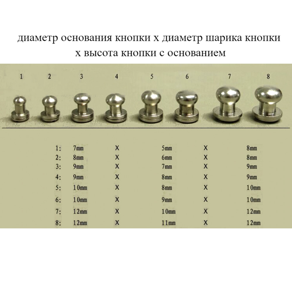 Размеры (мм): диаметр основания кнопки х Диаметр шарика (головки кнопки) х высота кнопки х высота столбика-ножки от головки до основания