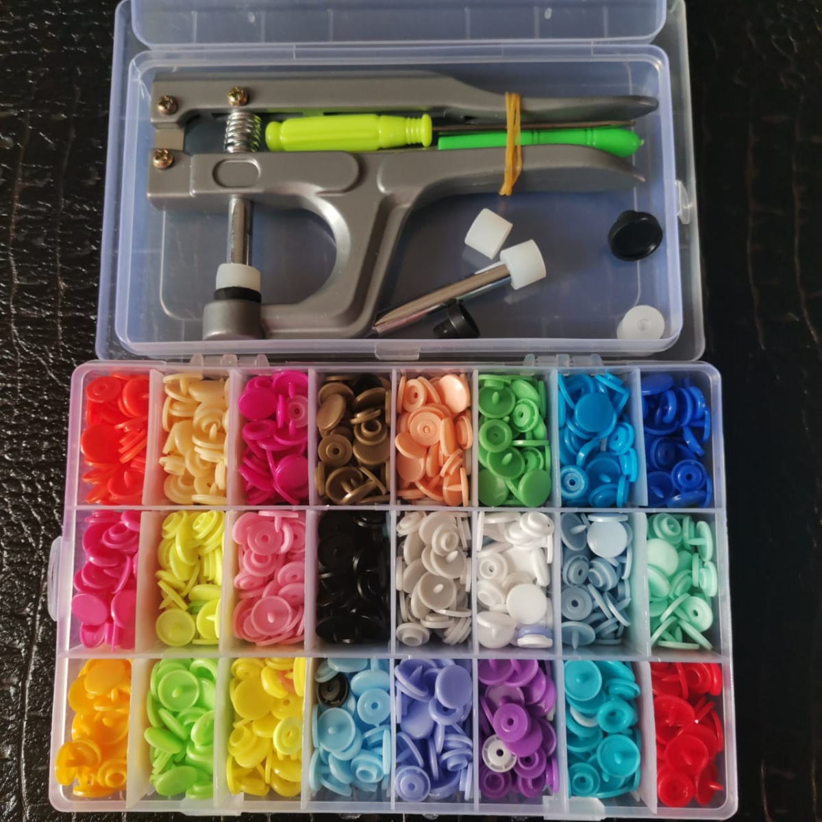 Набор пластиковых кнопок с комплекте с инструментами и прессом.