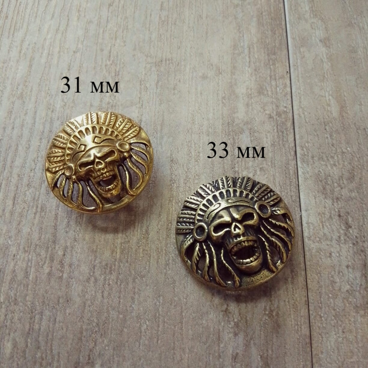 Металлические украшения для кожи - кончо в виде черепа с индейскими перьями. В диаметрах 31 и 33 мм