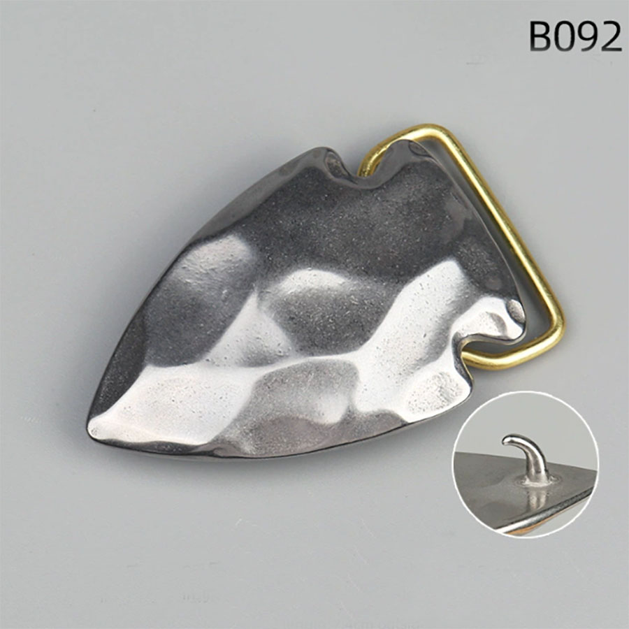 Пряжка для ремня с шипом в цвете белая медь, с необычным рисунком и нестандартной формы - в виде наконечника копья из каменного века