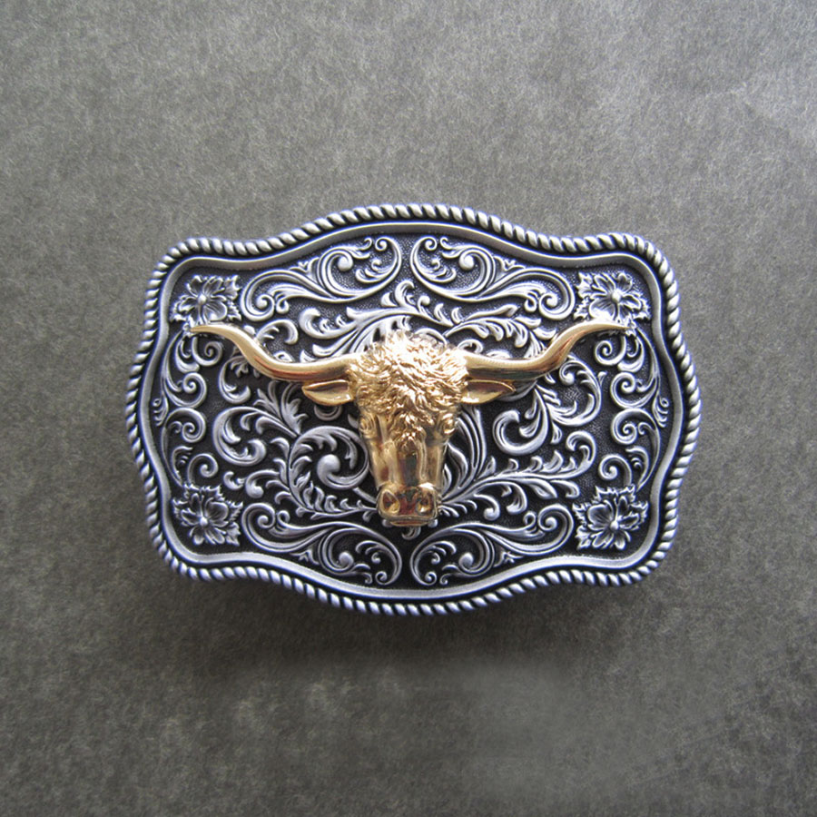 Солидная тяжелая декоративная пряжка высокого качества со специальным покрытием под черненое серебро, голова быка - с золочением, что обеспечивает долговечный блеск основной декоративной детали на имиджевой пряжке. Материал: цинковый сплав, крепление - из нержавеющей стали.