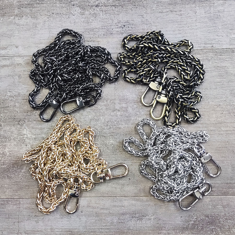 Цепочки представлены в разных цветовых вариантах - под никель/серебро, золото, темную латунь, черно-серый.