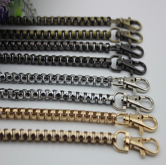 Декоративная галантерейная цепь с 2 карабинами (поворотными. Цепочки представлены в разных цветовых вариантах - под никель/серебро, золото, темную латунь, черно-серый. Галантерейные цепи подойдут для сумочек, клатчей и других галантерейных изделий