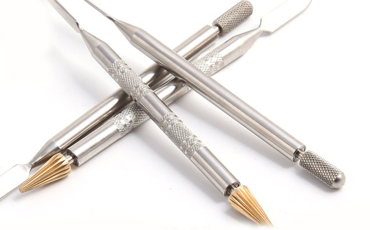 Инструмент двухсторонний - с одной стороны конус (цилиндр) для нанесения краски на урез кожи, с другой - шпатель для нанесения клея (химии) на кожу.
