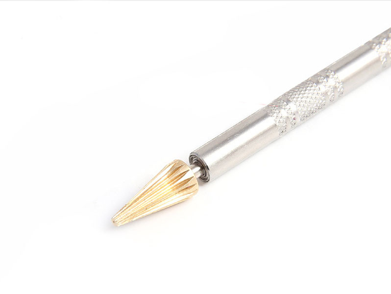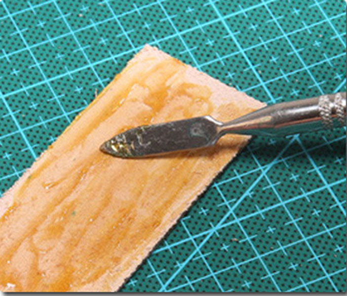 Ручку с вращающимся наконечником конической формы погружают в ёмкость с краской и проводят по урезу кожи, замши или ткани.