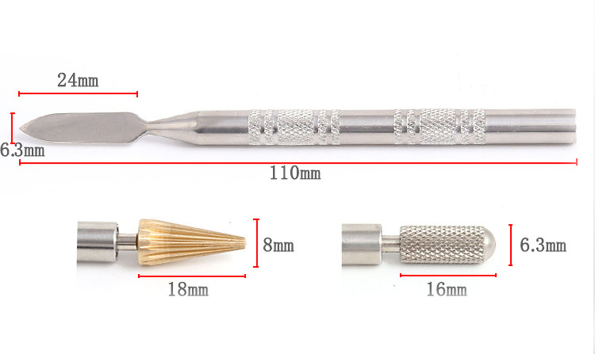 Инструмент двухсторонний - с одной стороны конус (цилиндр) для нанесения краски на урез кожи, с другой - шпатель для нанесения клея (химии) на кожу.