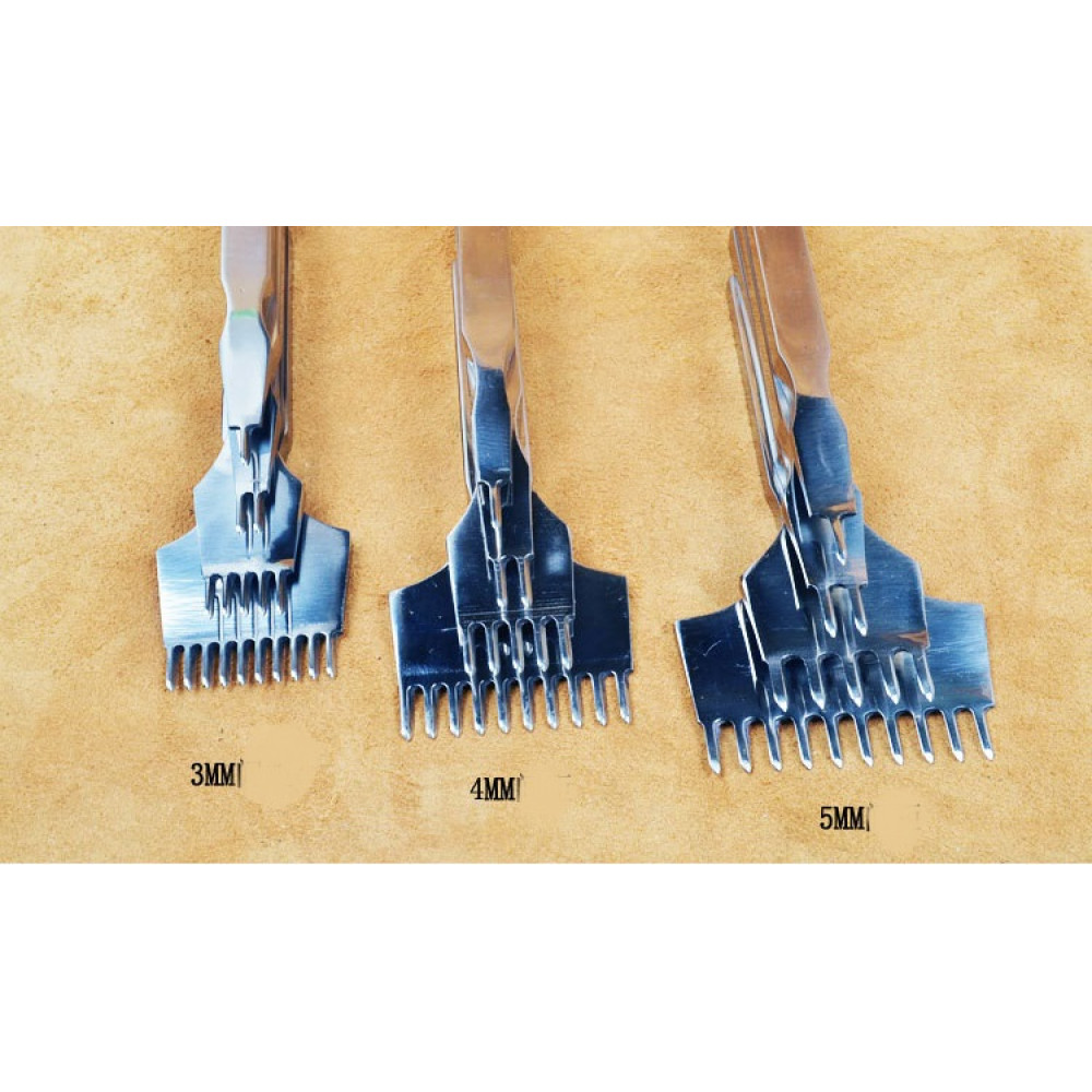 Набор строчных ромбовидных пробойников для ручного пошива изделий из кожи. Строчные (шаговые) просечки один из самых востребованные кожевенных инструментов. предназначен для пробивания аккуратных и равно удаленных друг от друга отверстий под шов в коже. Размер пробойников с шагом 3 мм обычно используют для самых тонких кож (пошив часовых ремешков, мелких галантерейных деталей), самый широкий шаг - для пошива шорно-седельных изделий из толстых кож.