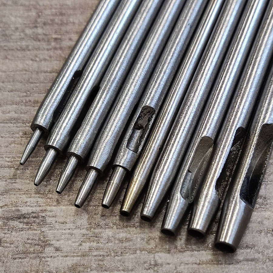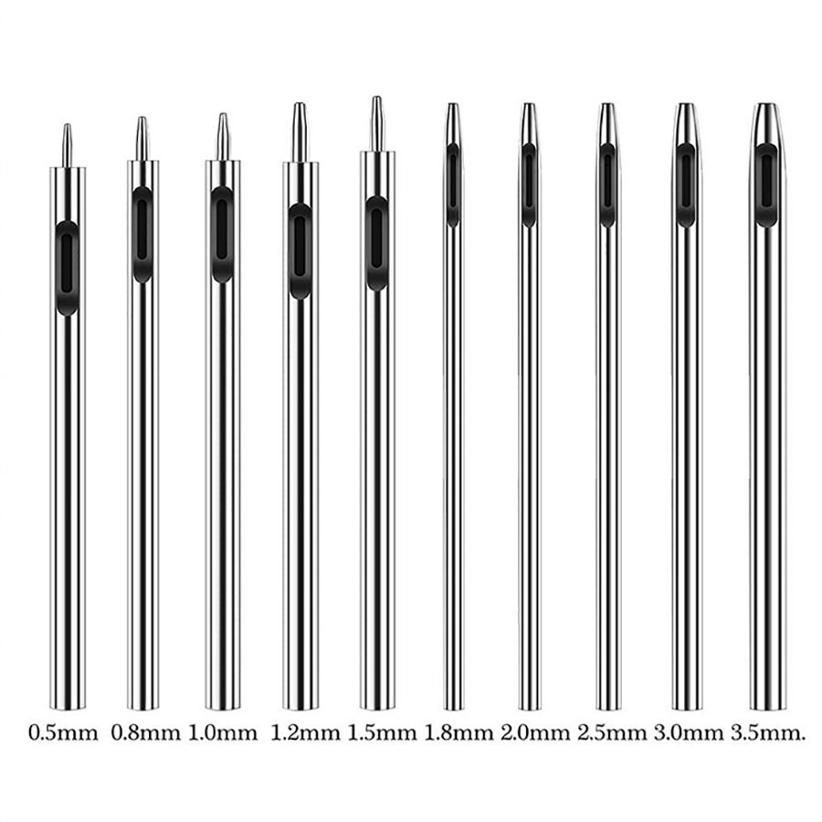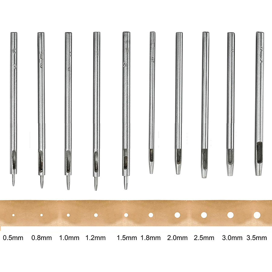 В наборе пробойники: 0,5 мм 0,8 мм 1,0 мм 1,2 мм 1,5 мм 1,8 мм 2,0 мм 2,5 мм 3,0 мм 3.5 мм.