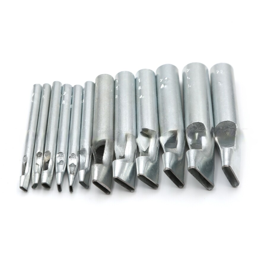 В наборе 12 пробойников разного размера (Длина отверстия х Ширина отверстия):