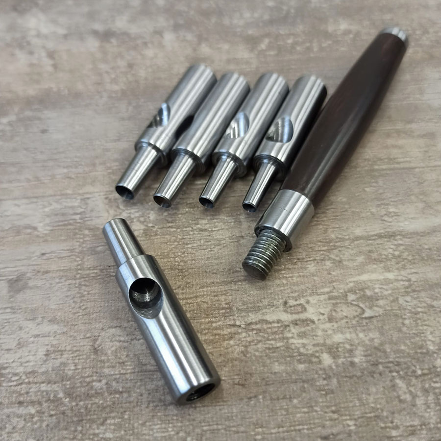 Семь сменных насадок: 2 - 2.5 - 3- 3.5 -4 - 4.5 - 5 мм с рукояткой. Размер пробойника промаркирован на инструменте.