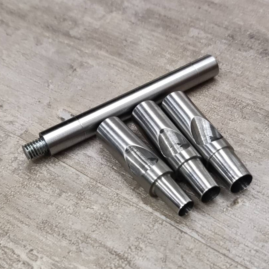 Три сменные насадки с рукояткой. Размер пробойника промаркирован на инструменте.