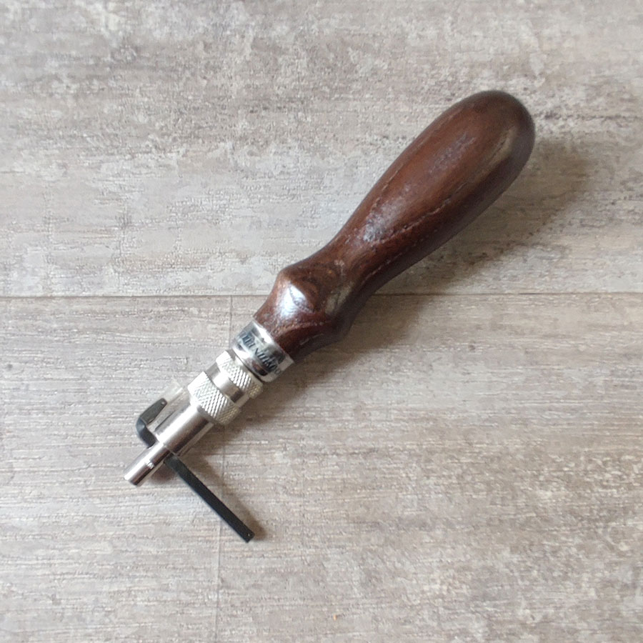 Канавкорез 53206 регулируемый на деревянной рукояти. Грувер - инструмент для работы с кожей, предназначенный для прорезания в коже полукруглого паза для последующего прошивания кожи по этому пазу.