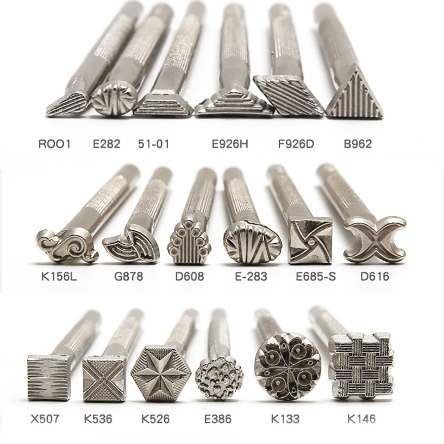 Металлические штампы для тиснения по коже разных размеров и форм: геометрические, растительные и др. орнаменты.
