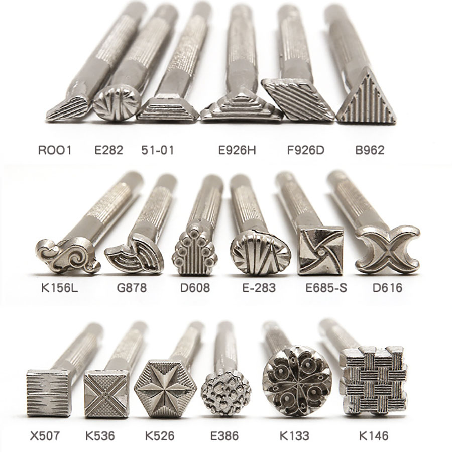 Металлические штампы для тиснения по коже разных размеров и форм: геометрические, растительные и др. орнаменты.