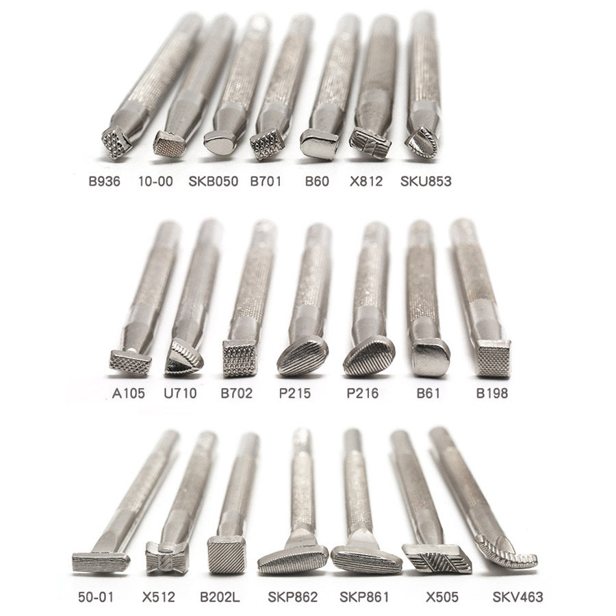 Металлические штампы для тиснения по коже разных размеров и форм: геометрические, растительные и др. орнаменты.