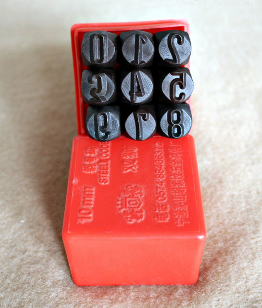 В наборе 9 штампов (цифры от 0 до 9) для нанесения логотипов и надписей на коже, металлических изделиях.