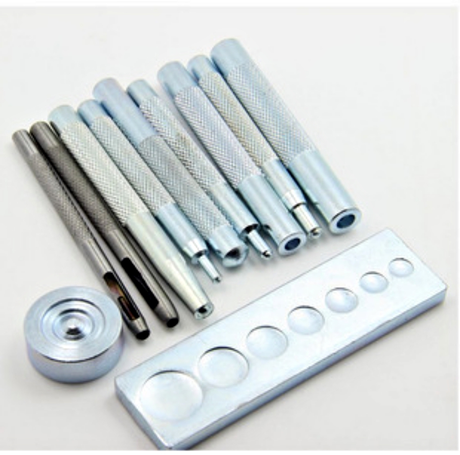 Набор из 11 предметов для ручной  установки швейной фурнитуры – металлических кнопок разных типов.