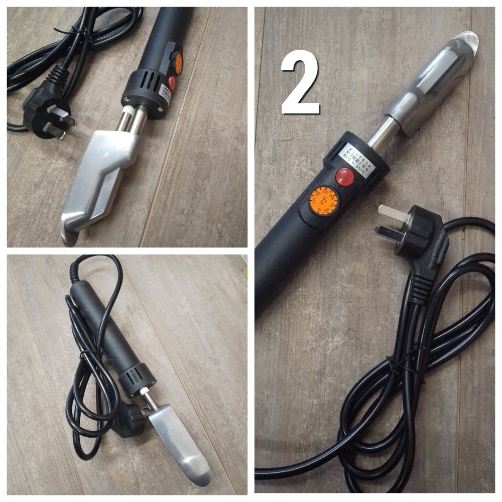 2 - электроутюжок с терморегулятором в виде поворотного диска, длина инструмента 280 мм, диаметр ручки 31 мм. Размер рабочей части нагревательного элемента 80*27 мм