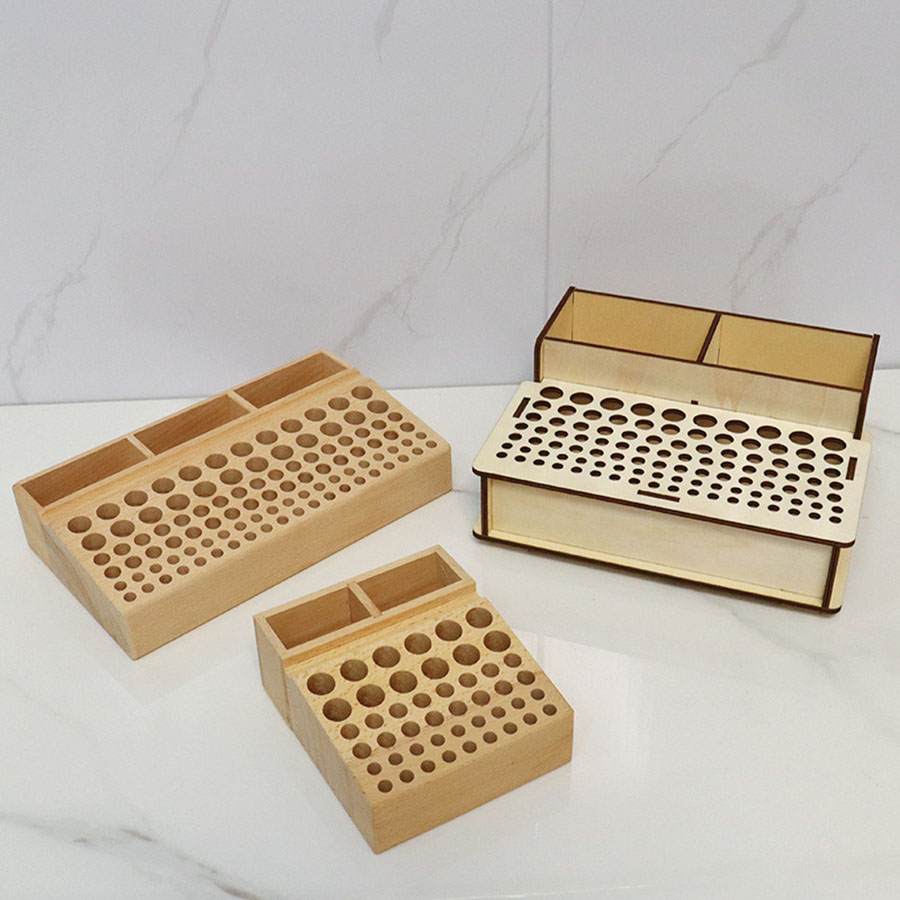 Подставка-органайзер с отверстиями разных диаметров для различных кожевенных инструментов и нитей