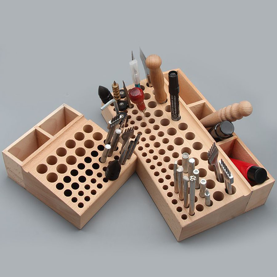 Добротная деревянная подставка-органайзер с отверстиями разных диаметров для различных кожевенных инструментов - пробойников, штампов, резаков, сликеров и других принадлежнойстей. Ящички не только организуют, но и украсят рабочее место