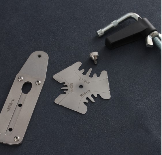 Очень удобный вспомогательный инструмент, облегчающий процесс пошива галантерейных изделий при изготовлении уголков деталей. Инструмент крепится к столешнице. Подойдет для работы с кожей и текстилем при проклейке скругленных уголков разных размеров, радиусом от 12 мм до 22 мм.