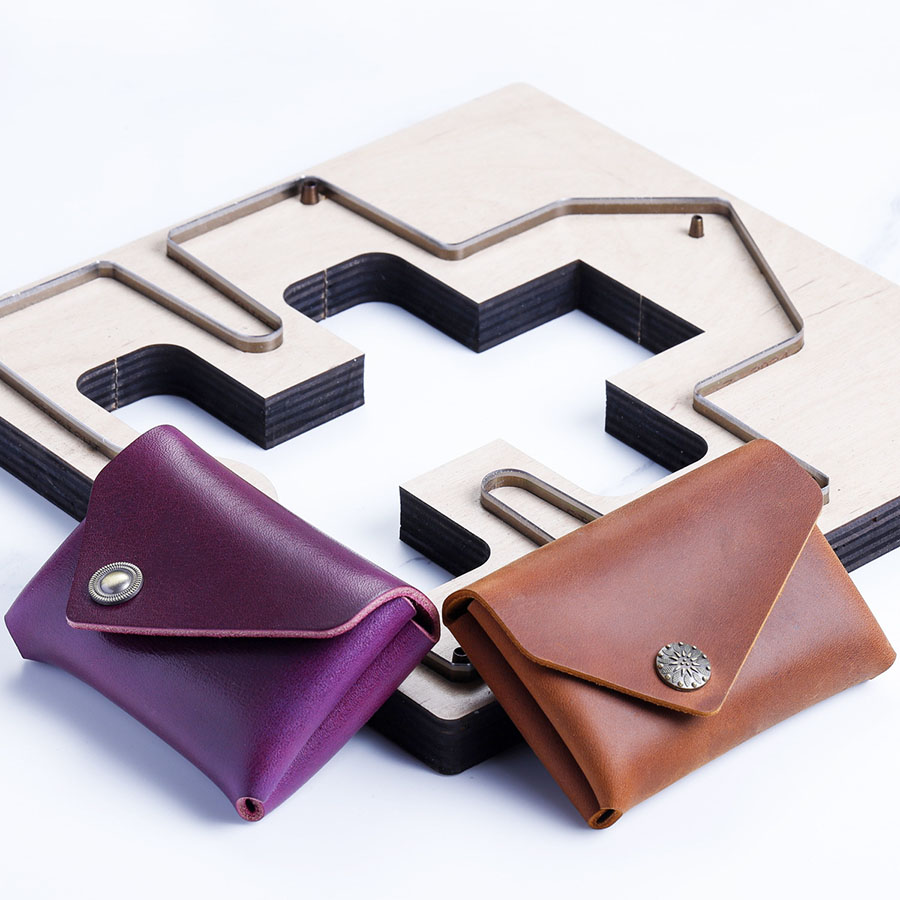 Вырубные штампы-штанцформы на деревянной основе для изготовление монетницы (кошелька). Позволяют получить готовую идеально ровную деталь и значительно сэкономить время на изготовление галантерейного изделия из кожи или других плотных материалов. Отличительная особенность штампа - наличие вставок для высечки отверстий круглого диаметра! Монетница собирается без швов, при помощи кнопок или хольнитенов.