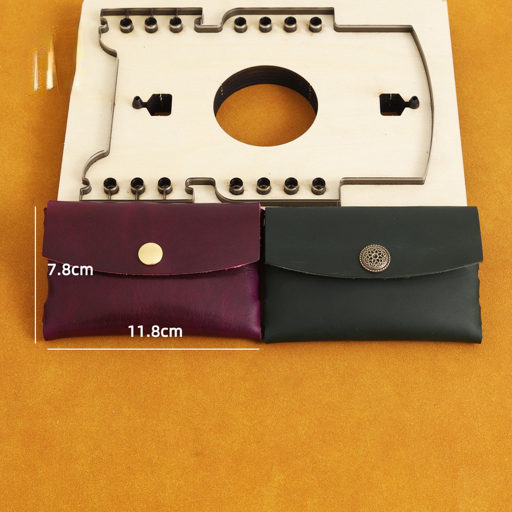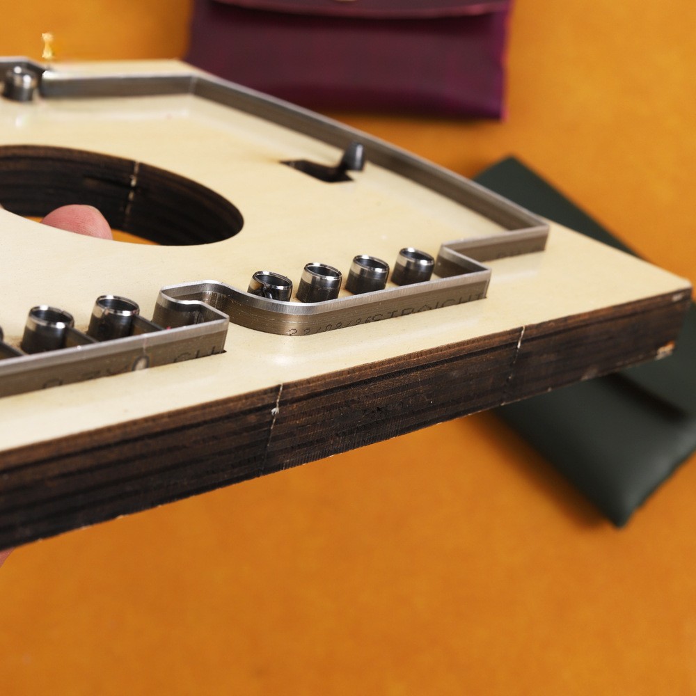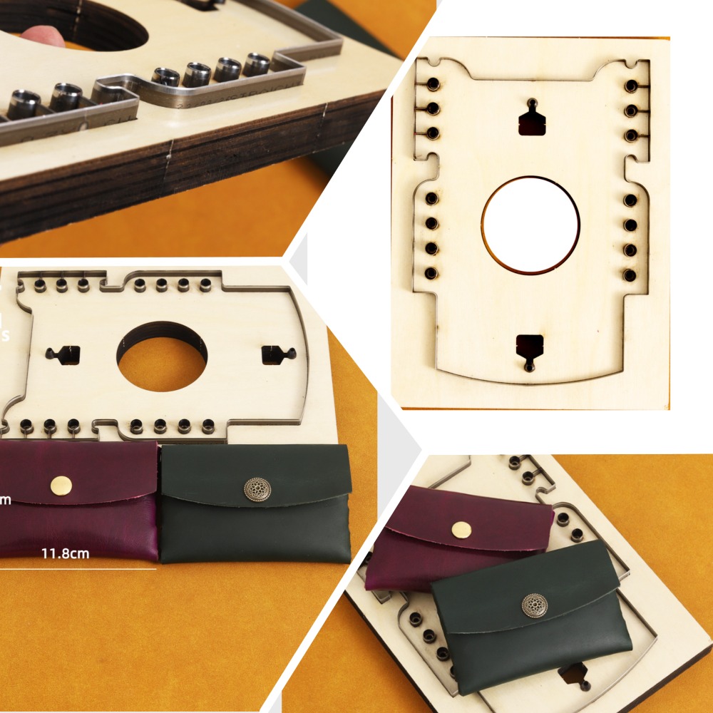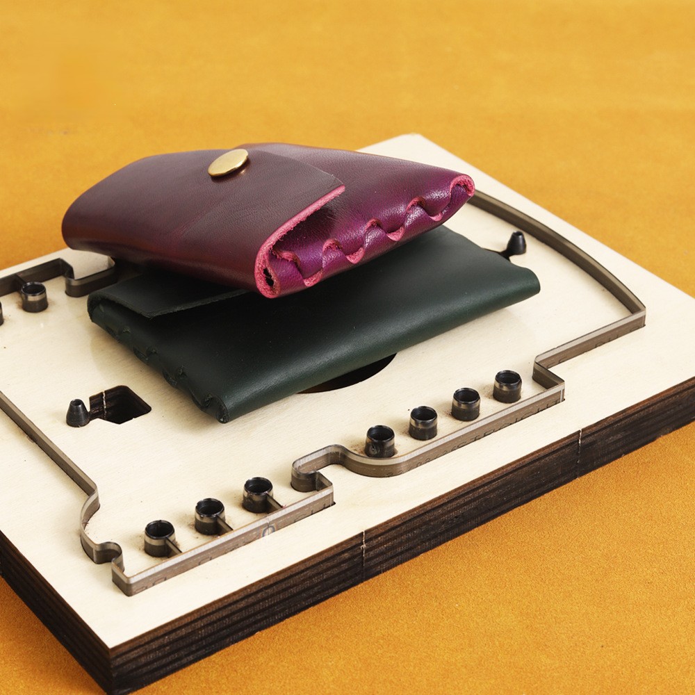 Вырубные штампы-штанцформы на деревянной основе для изготовление монетницы (кошелька). Позволяют получить готовую идеально ровную деталь и значительно сэкономить время на изготовление галантерейного изделия из кожи или других плотных материалов. Отличительная особенность штампа - наличие вставок для высечки отверстий круглого диаметра! Монетница собирается без швов, при помощи кнопок или хольнитенов.