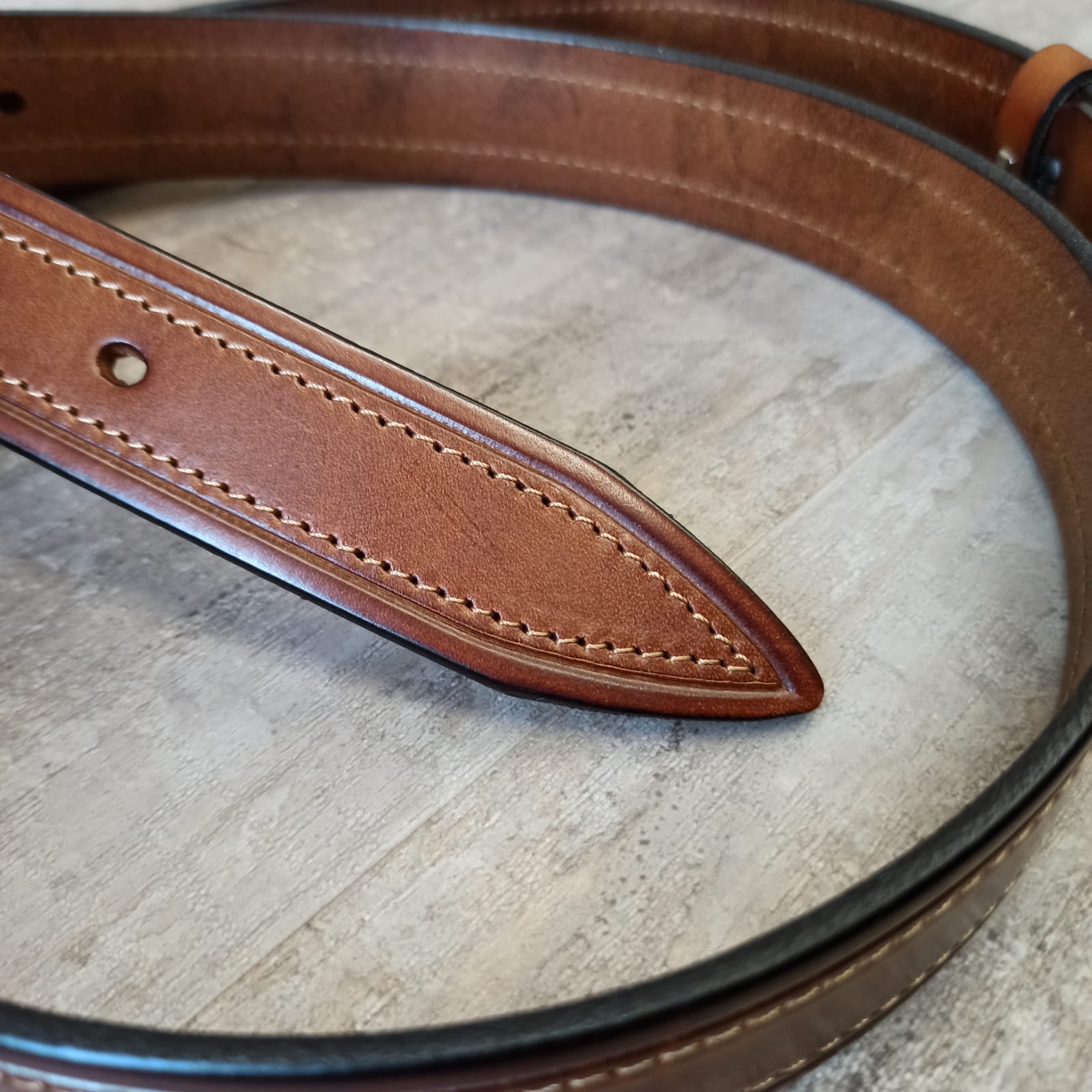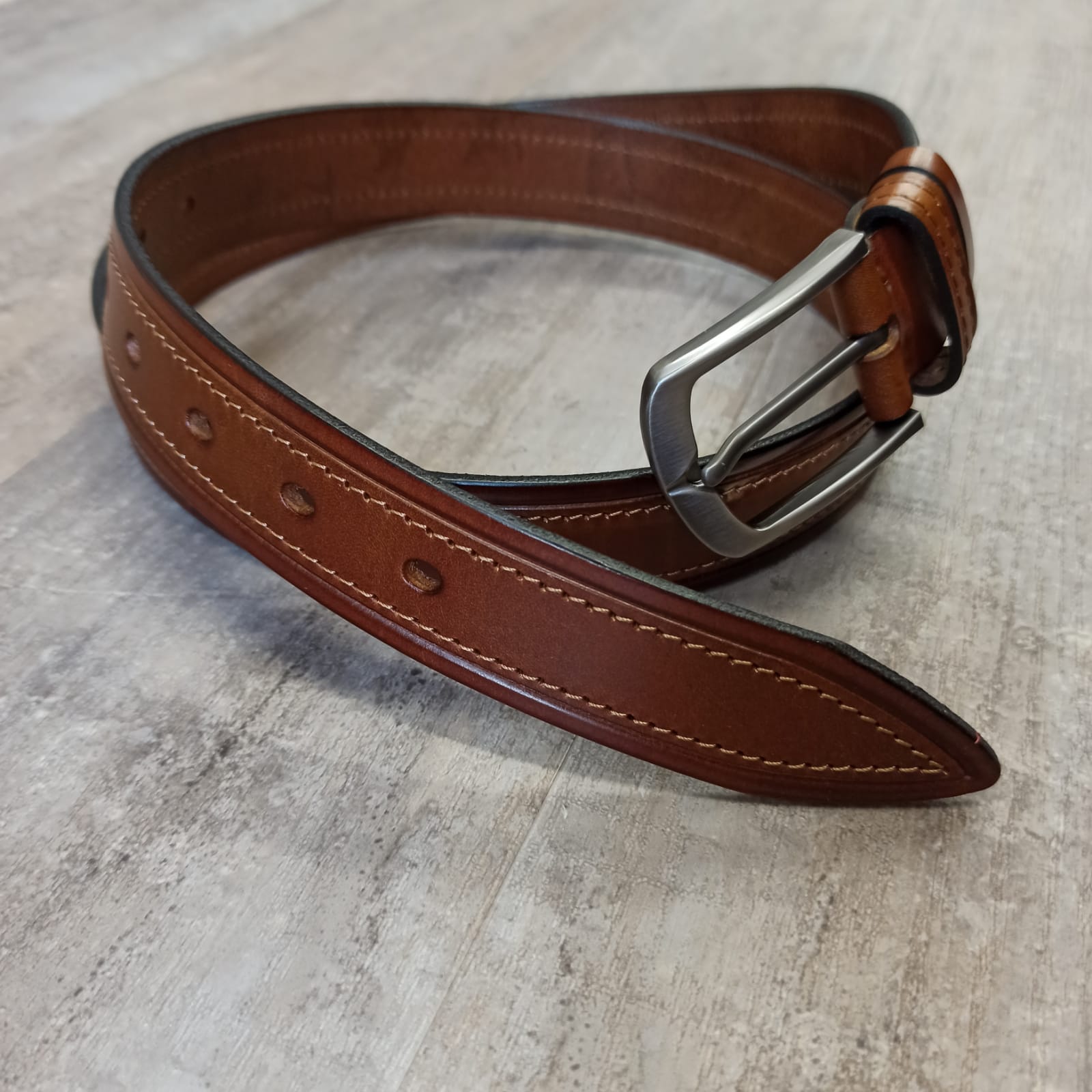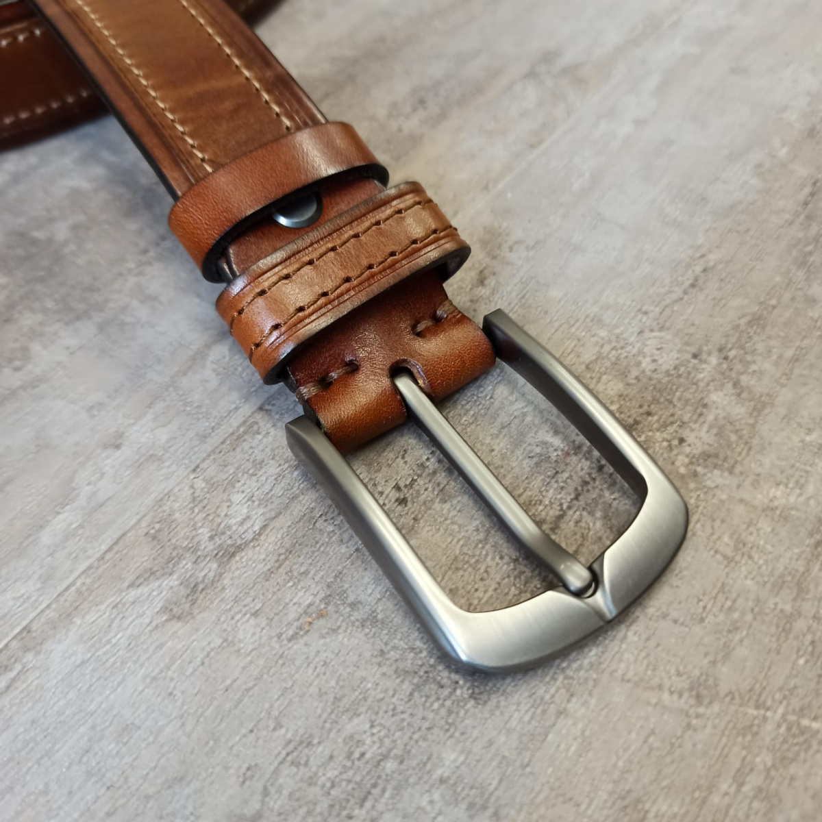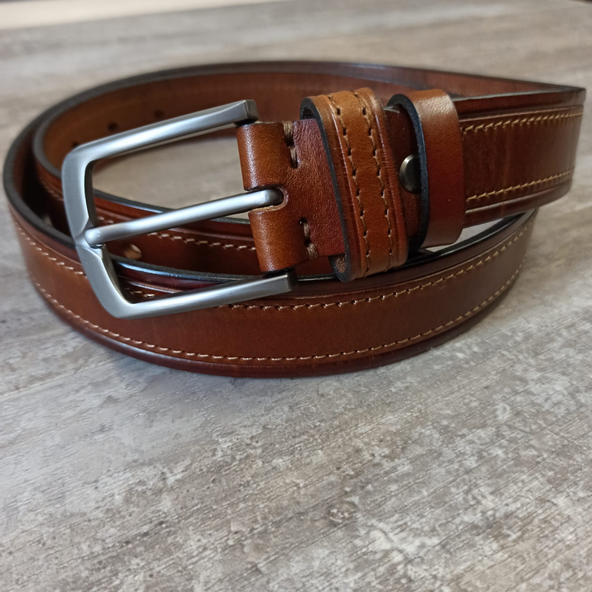 Ремень ручной работы из натуральной кожи с классической пряжкой, элегантной фаской, прошитый по краям. Выполнен из 100% натуральной итальянской кожи высокого качества. Натуральная кожа КРС - высокопрочный и износостойкий материал, который прослужит Вам много лет. Благодаря прошивке с обеих краев модель отличается повышенной устойчивостью к деформации.