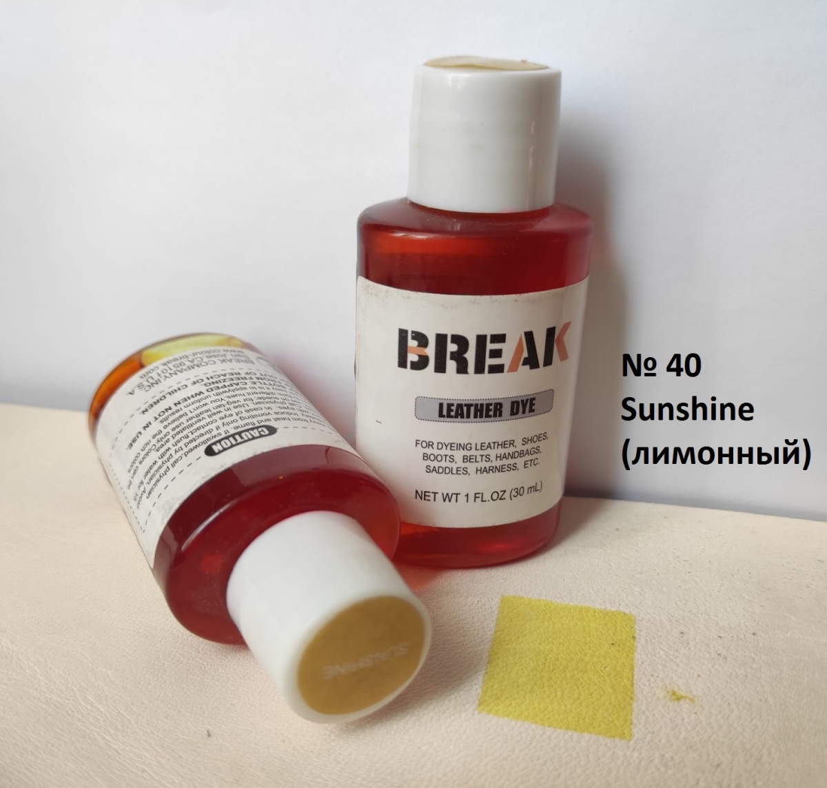 Краска для кожи на спиртовой основе от BREAK хорошо проникает в кожу, цвет плотно ложится, запах менее сильный, чем у краски Байонет. Краска BREAK наносится как вручную, так и аэрографом. Аэрограф необходимо сразу же хорошо промывать, так как остатки краски образуют пленку.