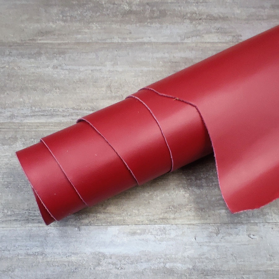 Кожа хромового дубления из шкур КРС. Эластичная, с подшлифованной лицевой поверхностью, с эмульсионным покрывным крашением, мелким тиснением «Пылевидка», толщина 1,2-1,4 мм. Цвет красный.