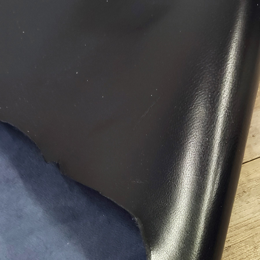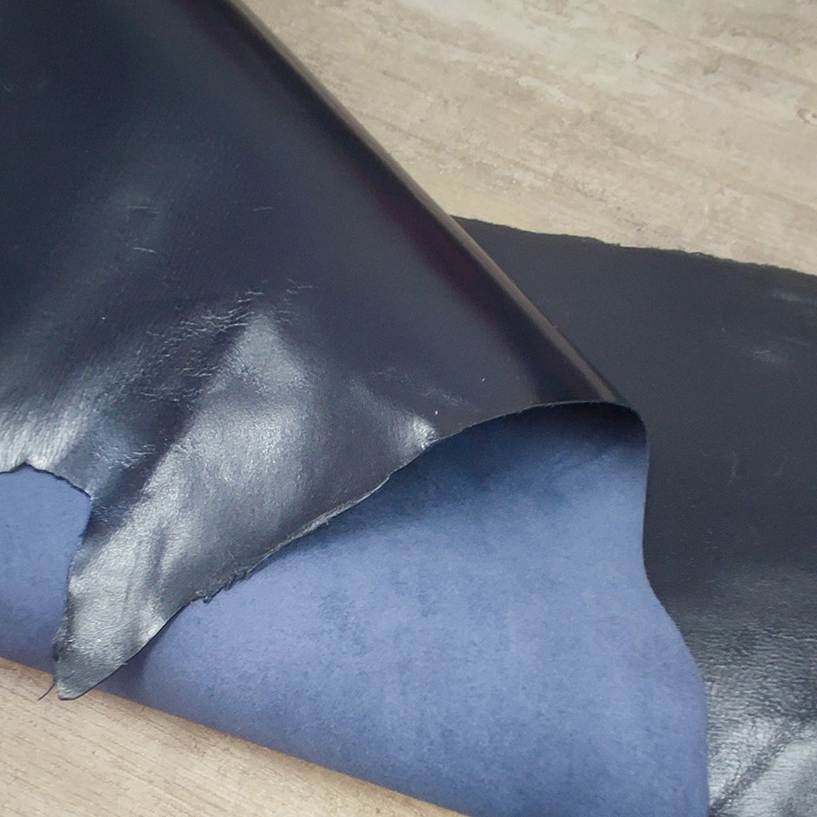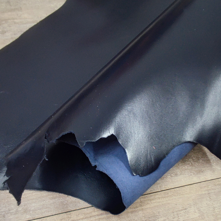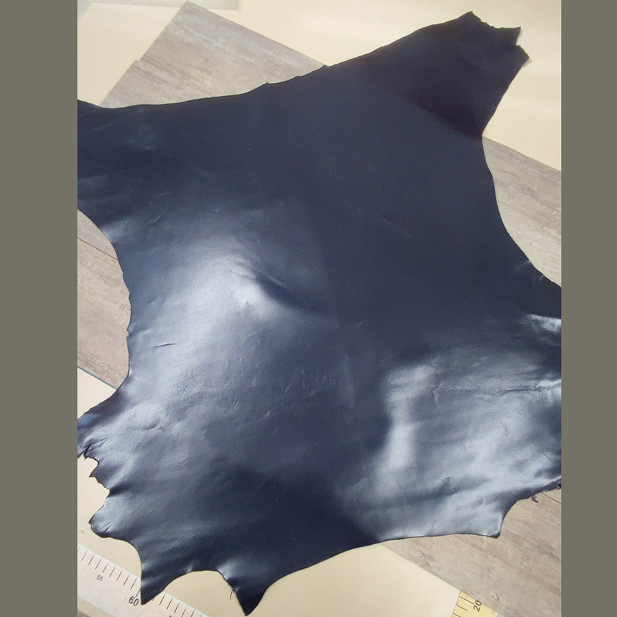 Кожа козы хромового дубления галантерейной выделки. Толщина кожи 0,7-0,9 мм. Лицо с финишным покрытием, фактурная гладкая поверхность. Бахтарма ровная, бархатистая. Цвет черно-синий, однородный глянцевый.