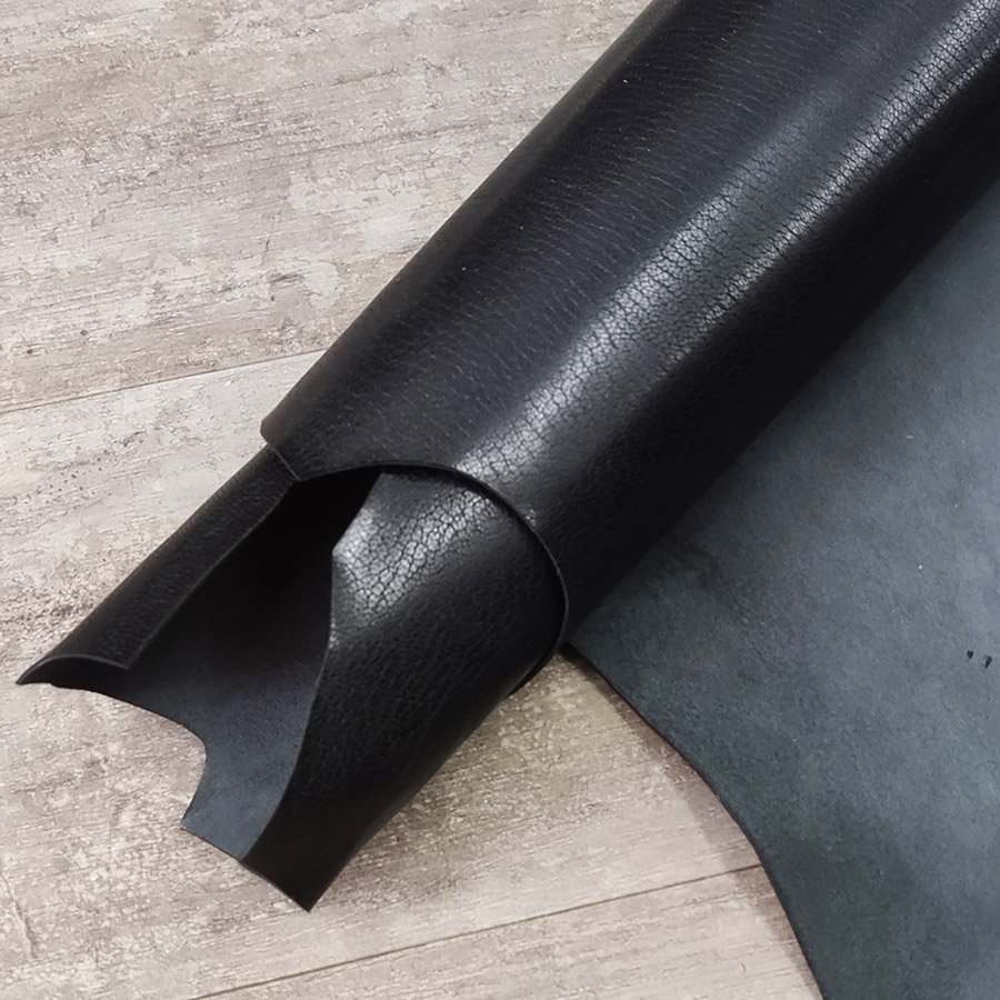 Кожа козы хромового дубления галантерейной выделки. Толщина кожи 1,0-1,1 мм. Лицо с финишным покрытием, фактурная гладкая поверхность. Бахтарма ровная, бархатистая. Цвет черный, однородный глянцевый.