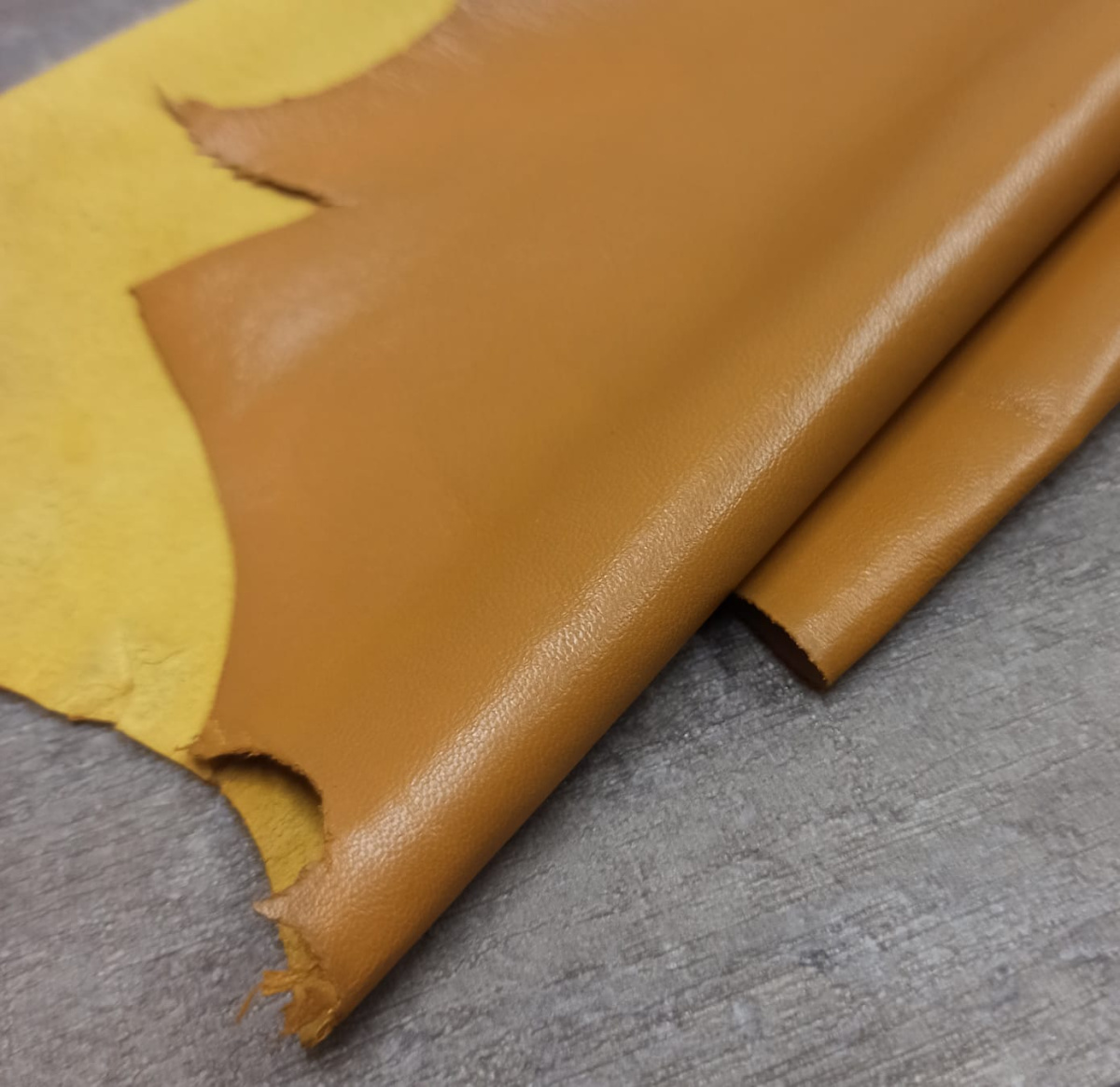 Кожа Овчина (МРС) комбинированного дубления. Толщина кожи 0,5-0,7 мм. Лицо с финишным покрытием, гладкая поверхность. Бахтарма ровная, бархатистая.