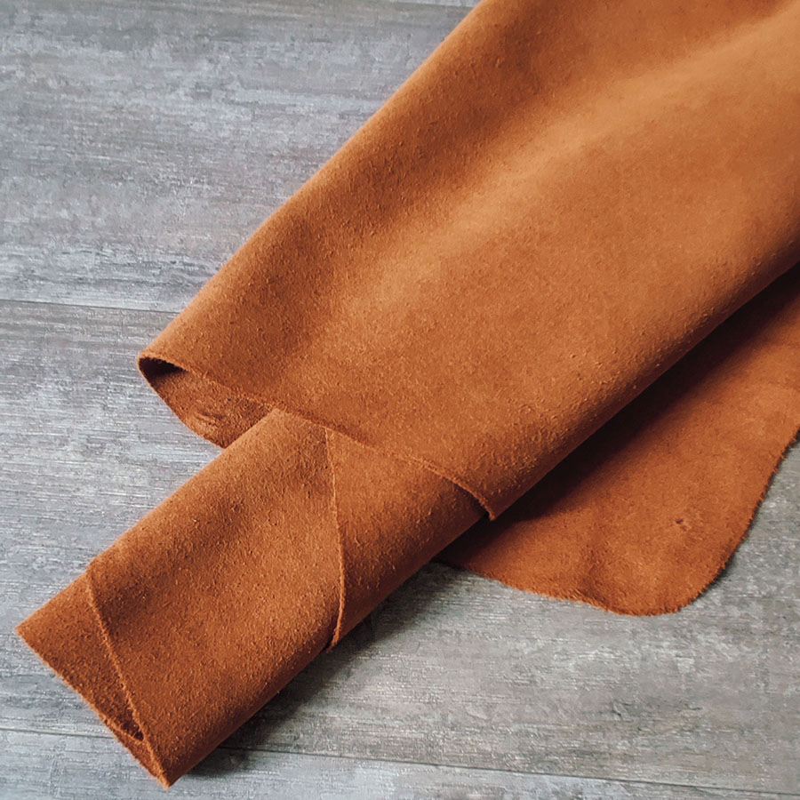 Кожа спилок с однородным ровным ворсом - велюр. Толщина 1,1-1,2 мм, мягкий, эластичный, разбит в барабане. Лицо чистого ровного цвета, бахтарма ровная. Отлично подойдет для пошива обуви, шляпок, сумок, клатчей, обложек, рюкзачков.