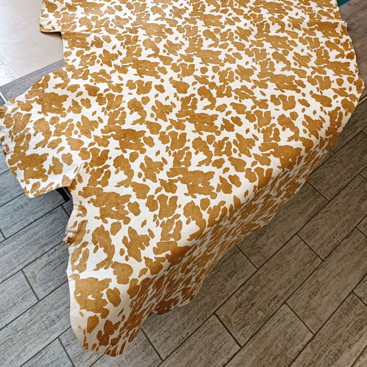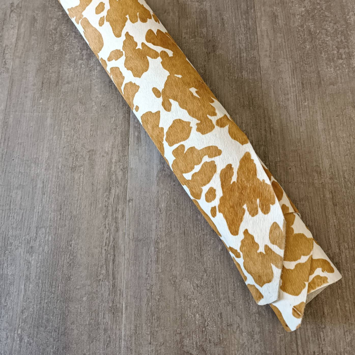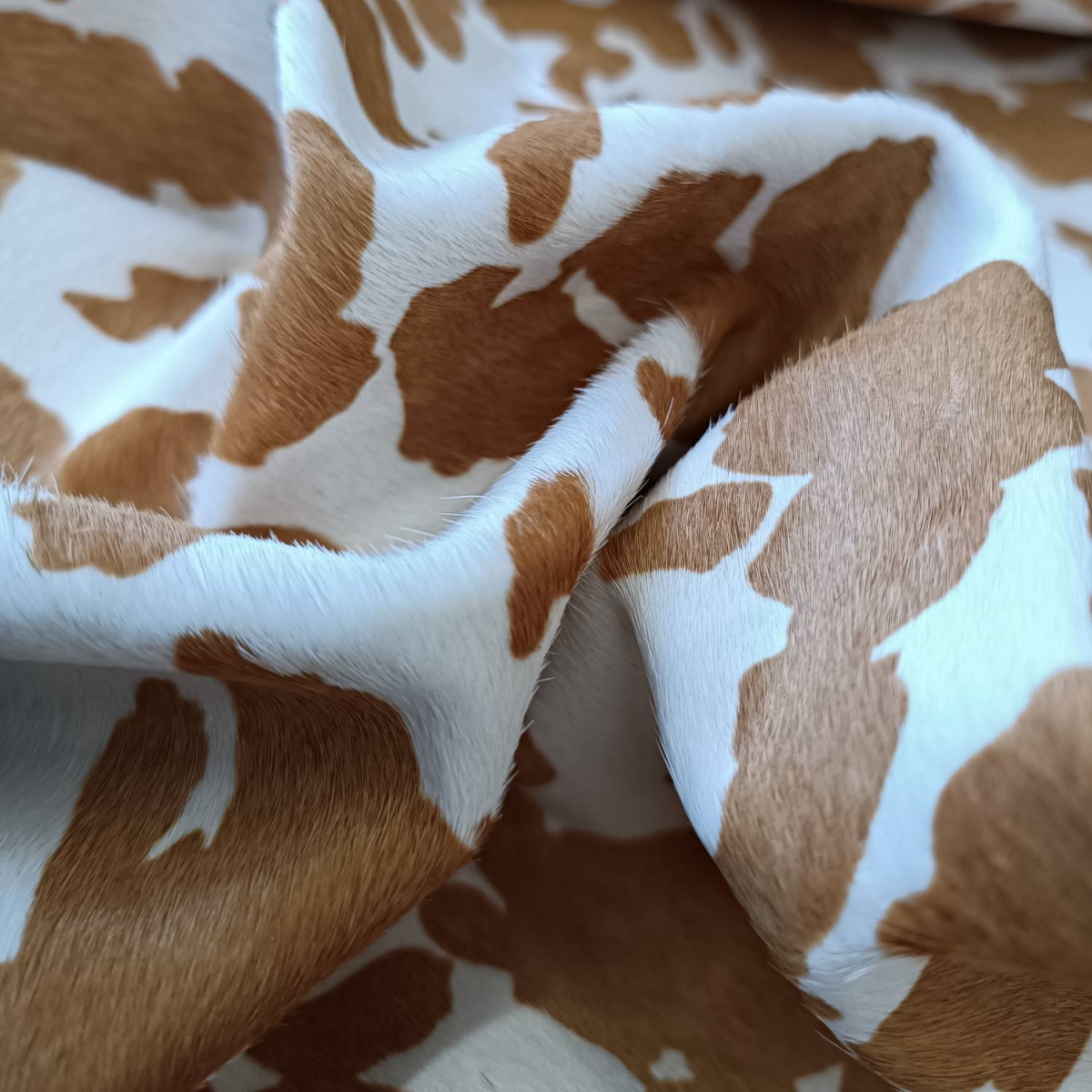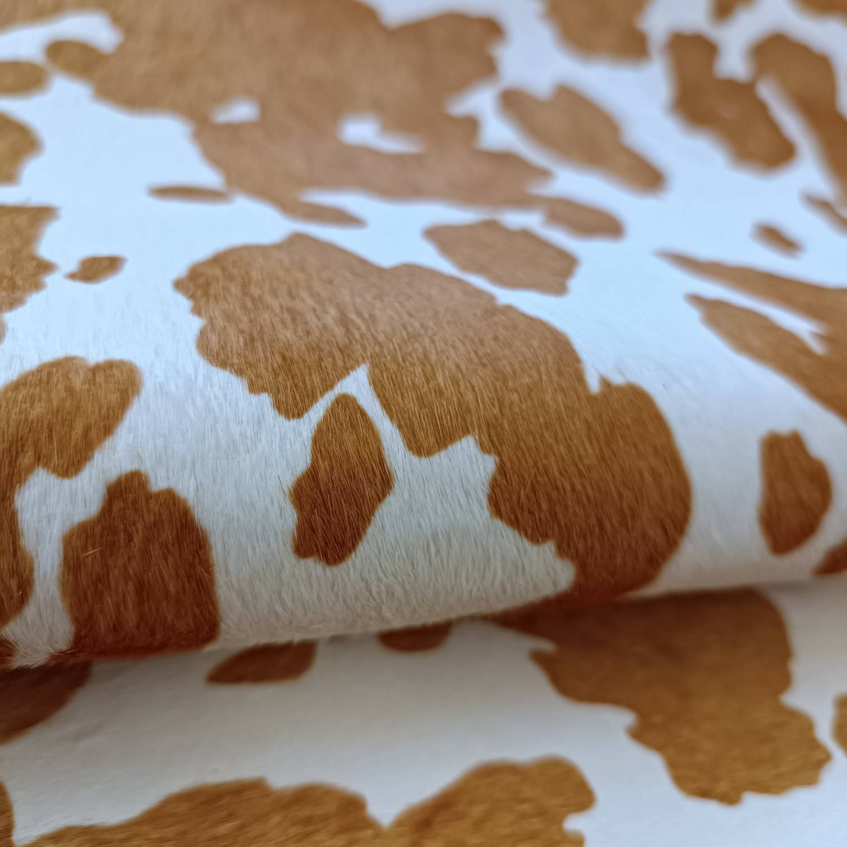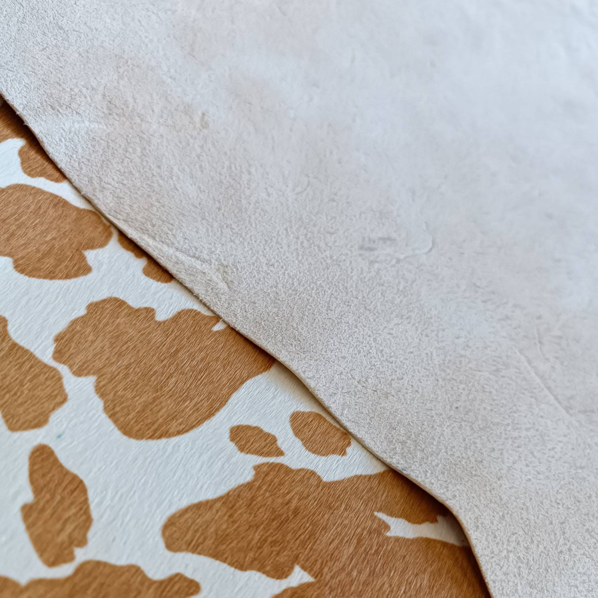 Натуральная кожа КРС с ворсом, принт под корову, светло коричнево -рыжие пятна на белом фоне. Ворс гладкий, очень низкий, под "бархат". Мездра ровная, гладкая.