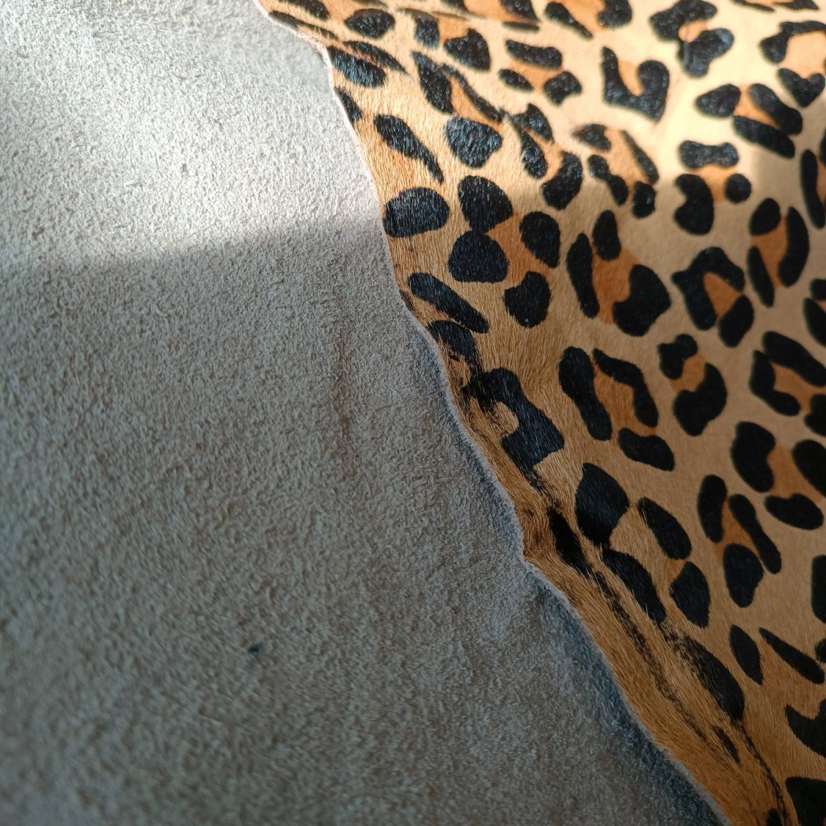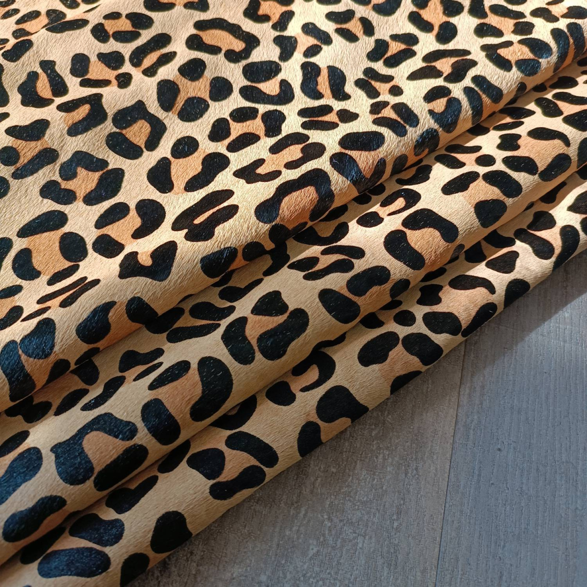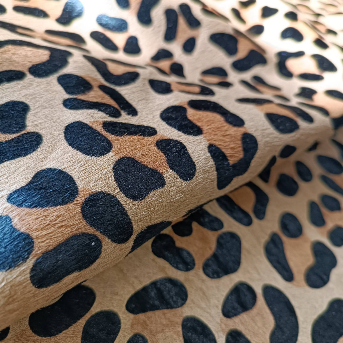 Натуральная кожа КРС с ворсом, принт под леопарда, черно пятна на рыжем фоне . Ворс гладкий, очень низкий, под "бархат". Мездра ровная, гладкая.