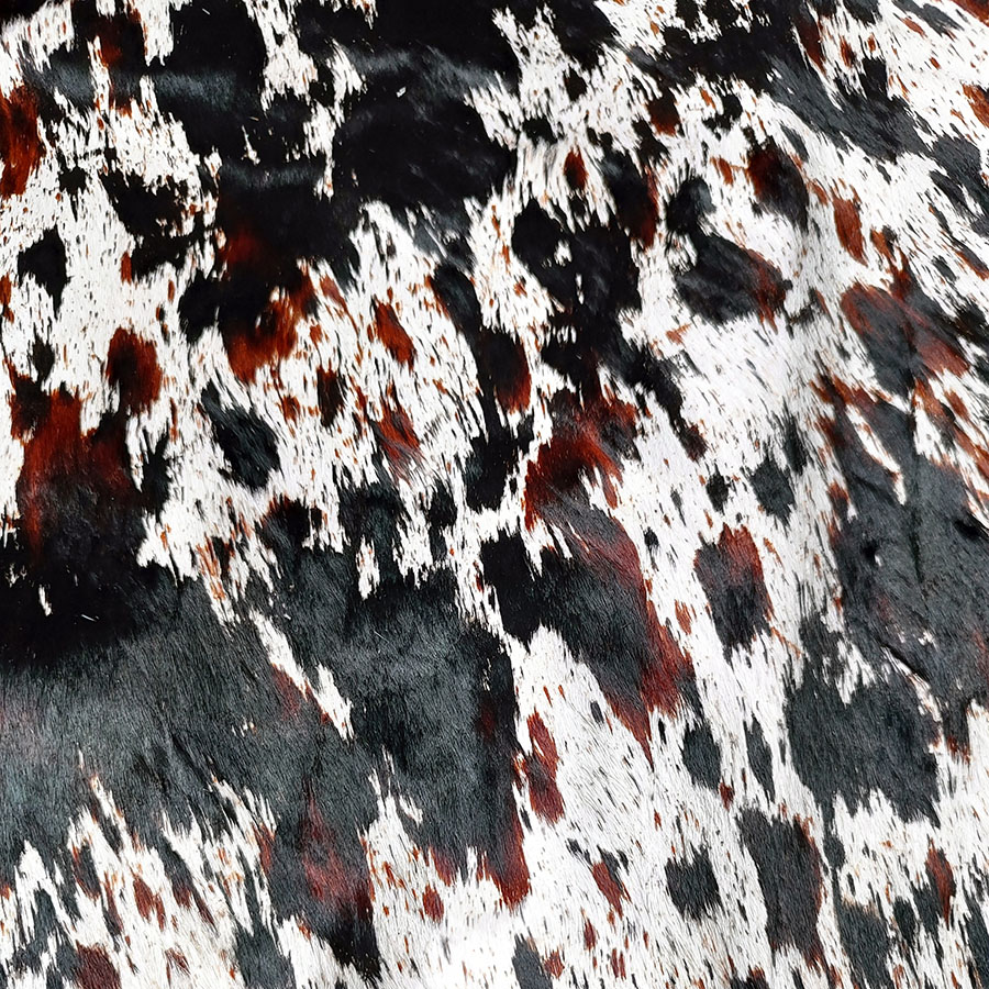 Натуральная кожа КРС с ворсом принт под корову три цвета - коричневые и черные крапины на белом фоне. Ворс гладкий, низкий. Мездра ровная, гладкая.