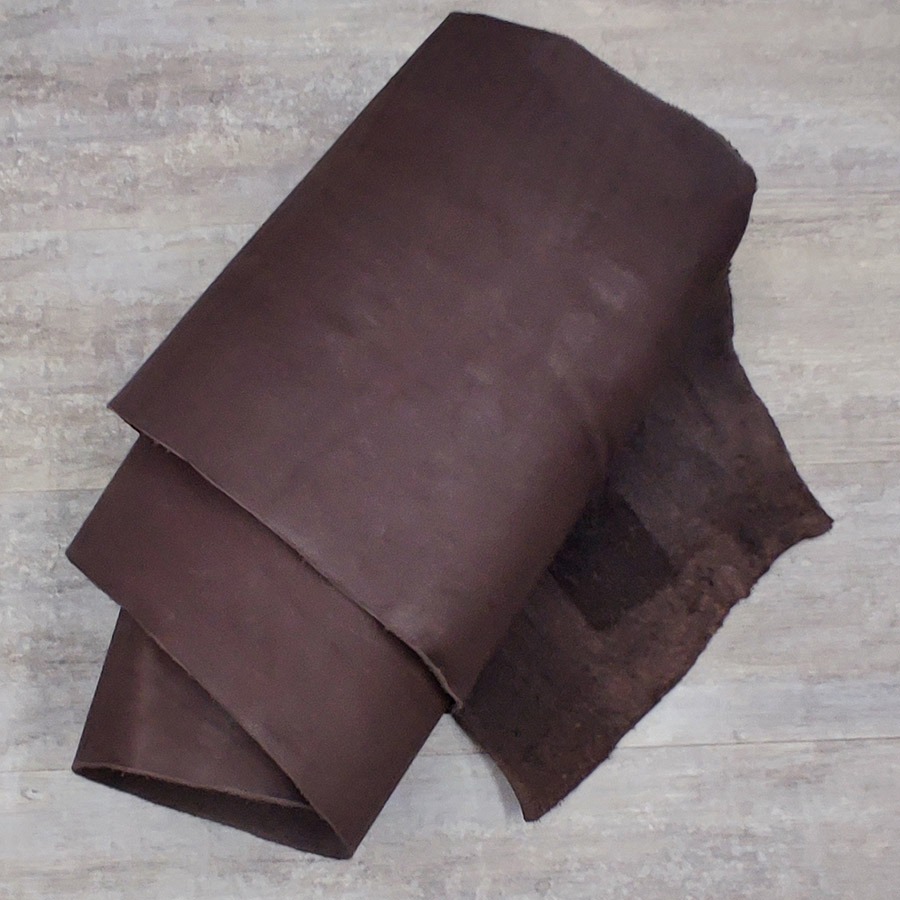 Пола без покрытия (в красте), производства Россия. Толщина 2,1-2,5. Подходит для изготовления ножен, ошейников, ремешков и прочих мелких изделий. В меру пластичная, не сухая, плотная. Бахтарма с низким ворсом. Сортность: без сорта.