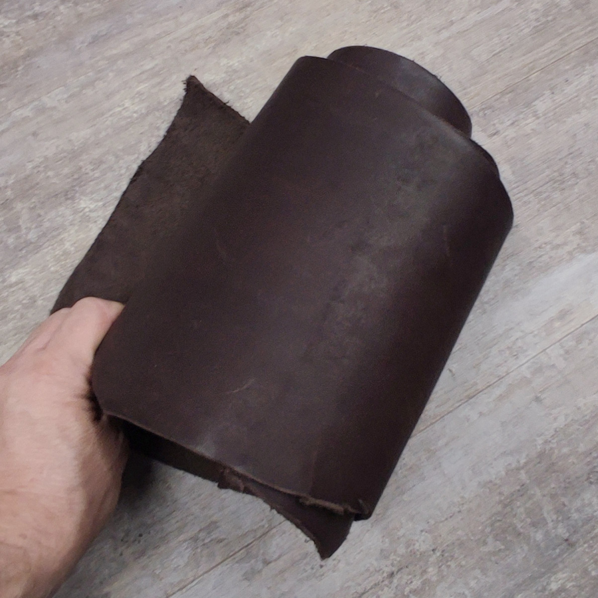 Пола без покрытия (в красте), производства Россия. Толщина 2,1-2,5. Подходит для изготовления ножен, ошейников, ремешков и прочих мелких изделий. В меру пластичная, не сухая, плотная. Бахтарма с низким ворсом. Сортность: без сорта.