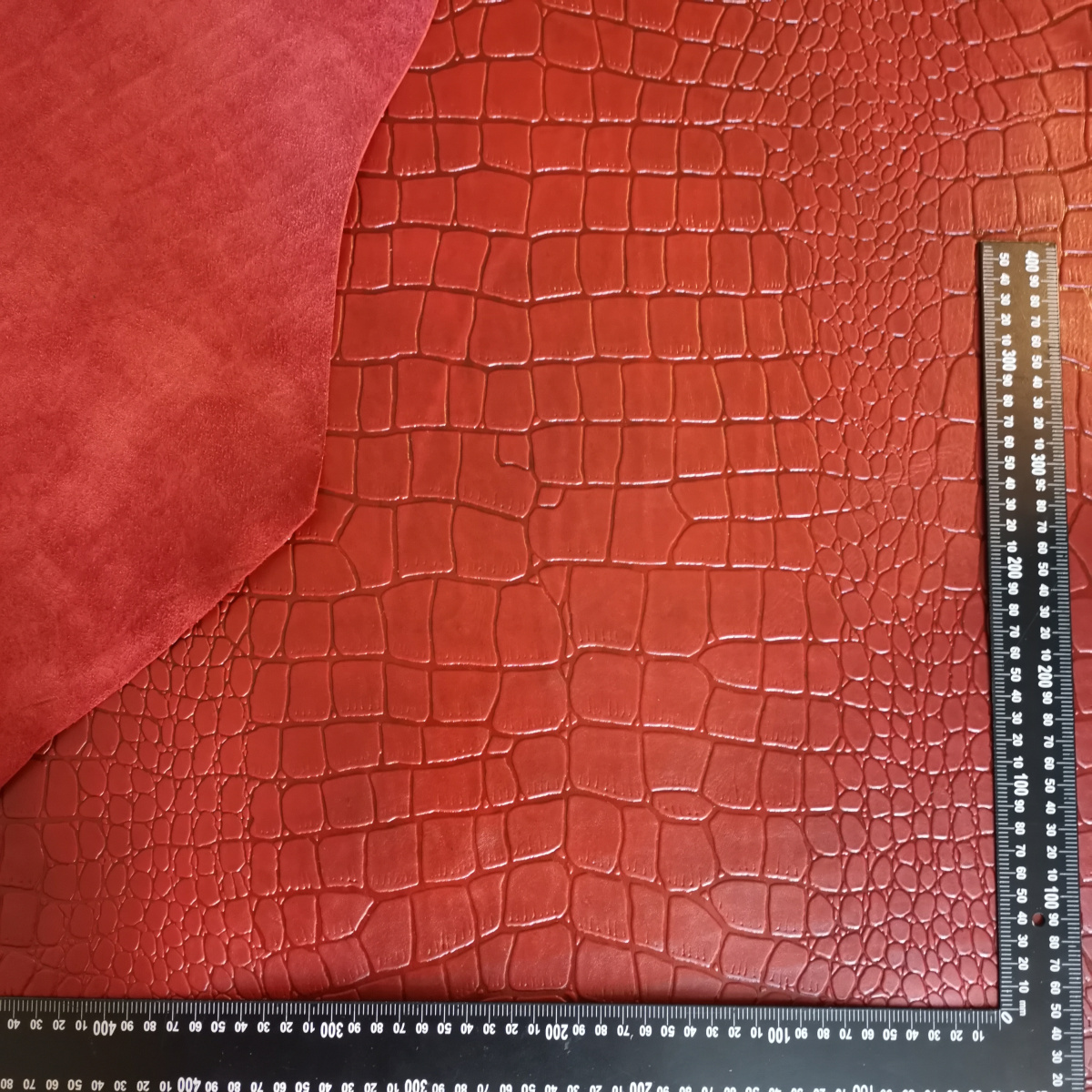 Кожа КРС комбинированного (растительнохромсинтанного) дубления с тиснением плитой "Камни". Кожа тонкая, плотная. Лицо гладкое, матовое, насыщенный красивый цвет и оригинальный узор. Тиснение ярко выраженное, глубокое, рисунок узора крупный.