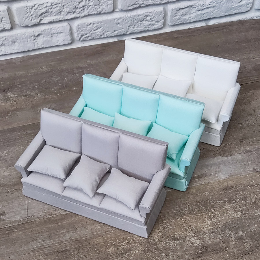 Однотонные трехместные диванчики для кукольного дома в миниатюре или румбокса - масштаб 1:12 (для кукол около 12 см)