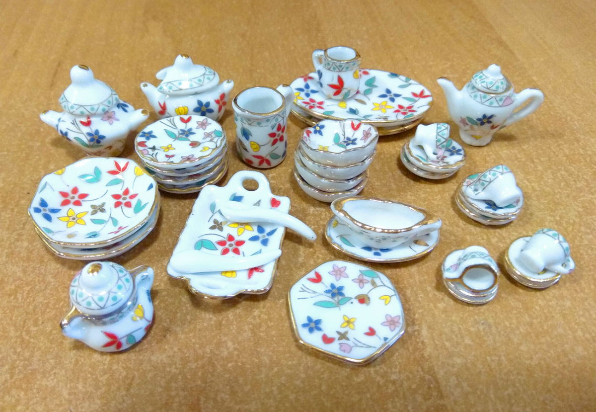 В набор входят столовые приборы, блюда, тарелки, чашки, кувшин, вазы и многое другое. Украсит не только миниатюрную кухню, но и большой кукольный холл