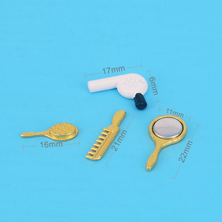 Набор миниатюрных принадлежностей для кукольной ванной комнаты: фен, две расчески и зеркальце.