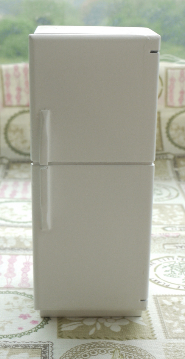 Холодильник белый деревянный с морозильным отделением. Дверцы открываются, внутри полочки.